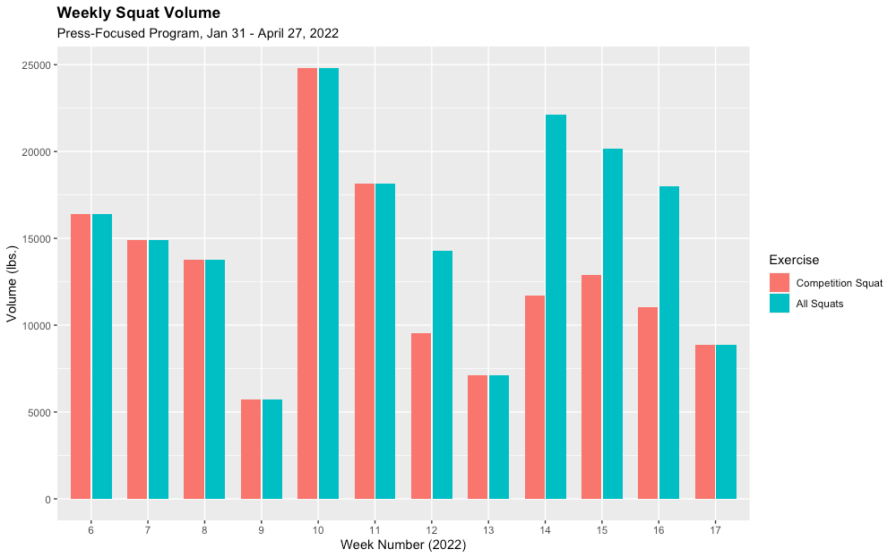 Below is a simple example of this. When my shoulder started bothering me during this training block, I began to incorporate squats with the safety squat bar. So when thinking about my "squat" volume during this period, what I really want to see is all of my squatting—not just my "competition squat." But typical lifting apps only track volume by single exercises.