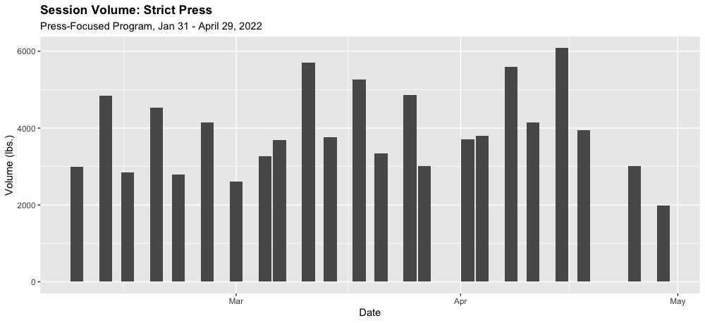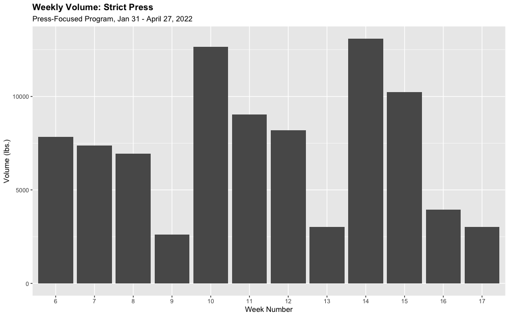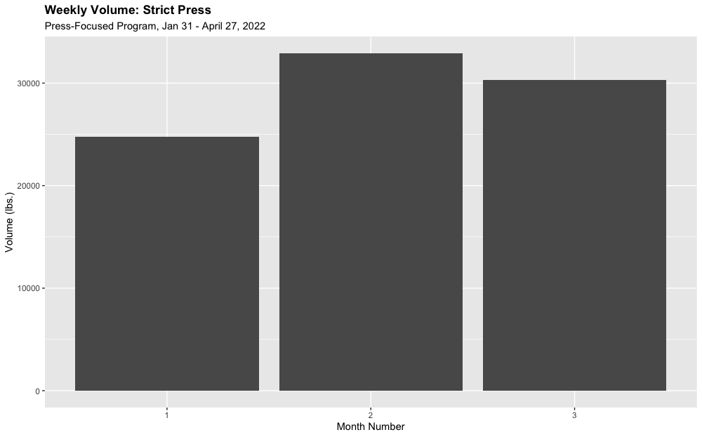 This was a good block in one sense: I was consistent. But a shoulder injury (see the lower weights at the end of the Strict Press graph) and COVID prevented me from testing my one-rep maxes at the end of the block. This was a bummer, but having these nice-looking charts at the end of the training block still gave me some small sense of achievement.
