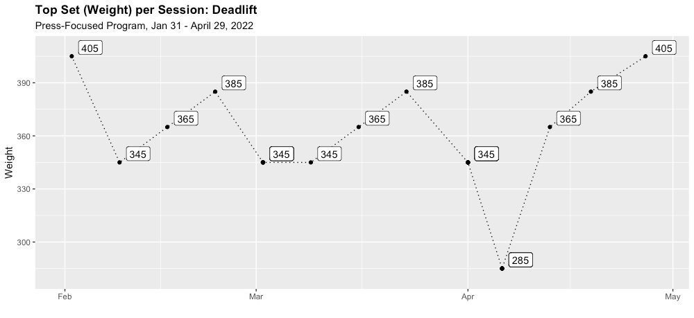 Below is the type of chart you're likely to see in many lifting apps: a simple visual of the maximum weight I deadlifted (at least once) in each session of my last complete training block. But this chart is missing a key piece of information: repetitions. How many times did I lift this weight in my "top set?"