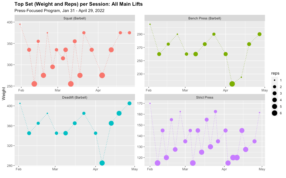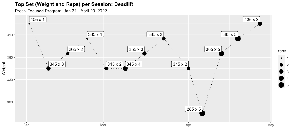 Because rep ranges might actually be the thing you are progressing during a training block, I've always wanted to see the following chart, which shows both the max weight lifted and the number of reps (represented by point size). I've added labels to make it a little easier to read.